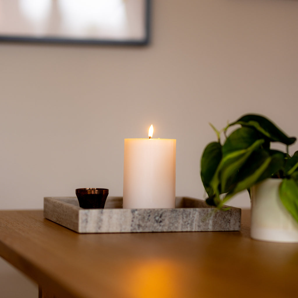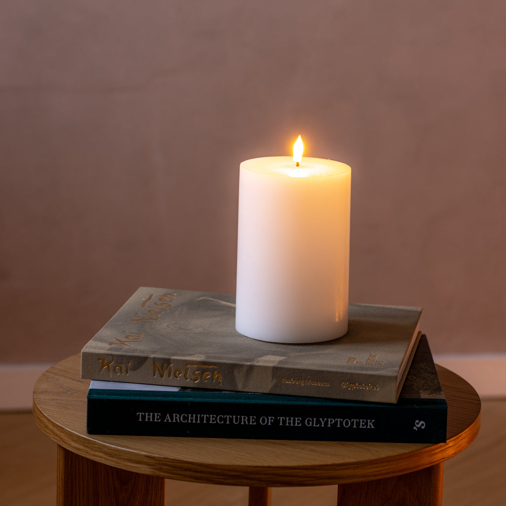 De witte Rika LED-pilaarkaarsen stellen je in staat om gezellige momenten te creëren zonder je zorgen te hoeven maken over roet, schadelijke deeltjes of het risico op brand.